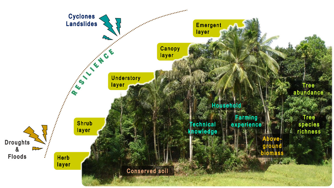 Resilience of the homegarden ecosystem can be improved by the presence of perennial trees and associated environment that facilitate various ecosystem services, particularly provisioning and supporting services.