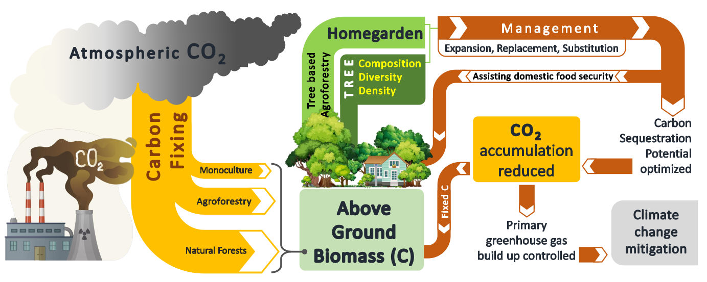 Tree-based, vertically stratified homegardens possess a significant potential to act as modern carbon storages reducing the pressure on natural forests due to supply of timber which are known as the primary carbon stocks.