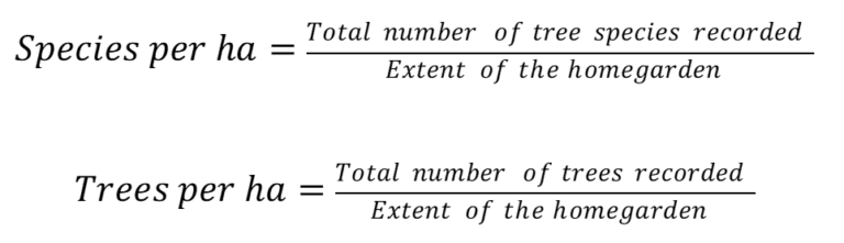 Species density, which represents the number of tree species per hectare (Eqn. 2), and tree density, which represents the number of individual trees per hectare (Eqn. 3), were calculated by dividing the total recorded number of species and trees by the extent of the respective homegarden. The area of each homegarden, measured in acres, was recorded as a survey question.