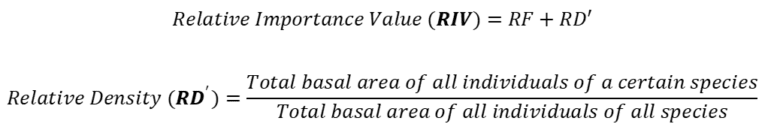 Several different methods have been employed in various studies to determine the importance value of species. However, for the present study, the relative importance value (RIV) was calculated, as shown in Eqn. 5, by utilizing the relative frequency (RF) and relative dominance (RD’) of tree species.